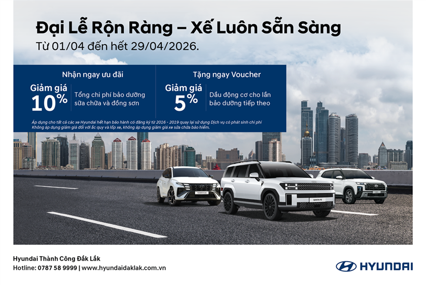 Nhằm mang đến sự an tâm cho khách hàng trong dịp nghỉ lễ 30/4 - 1/5, Hyundai Đắk Lắk triển khai chương trình ưu đãi dịch vụ đặc biệt “Đại Lễ Rộn Ràng - Xế Luôn Sẵn Sàng” trong tháng 4/2026.